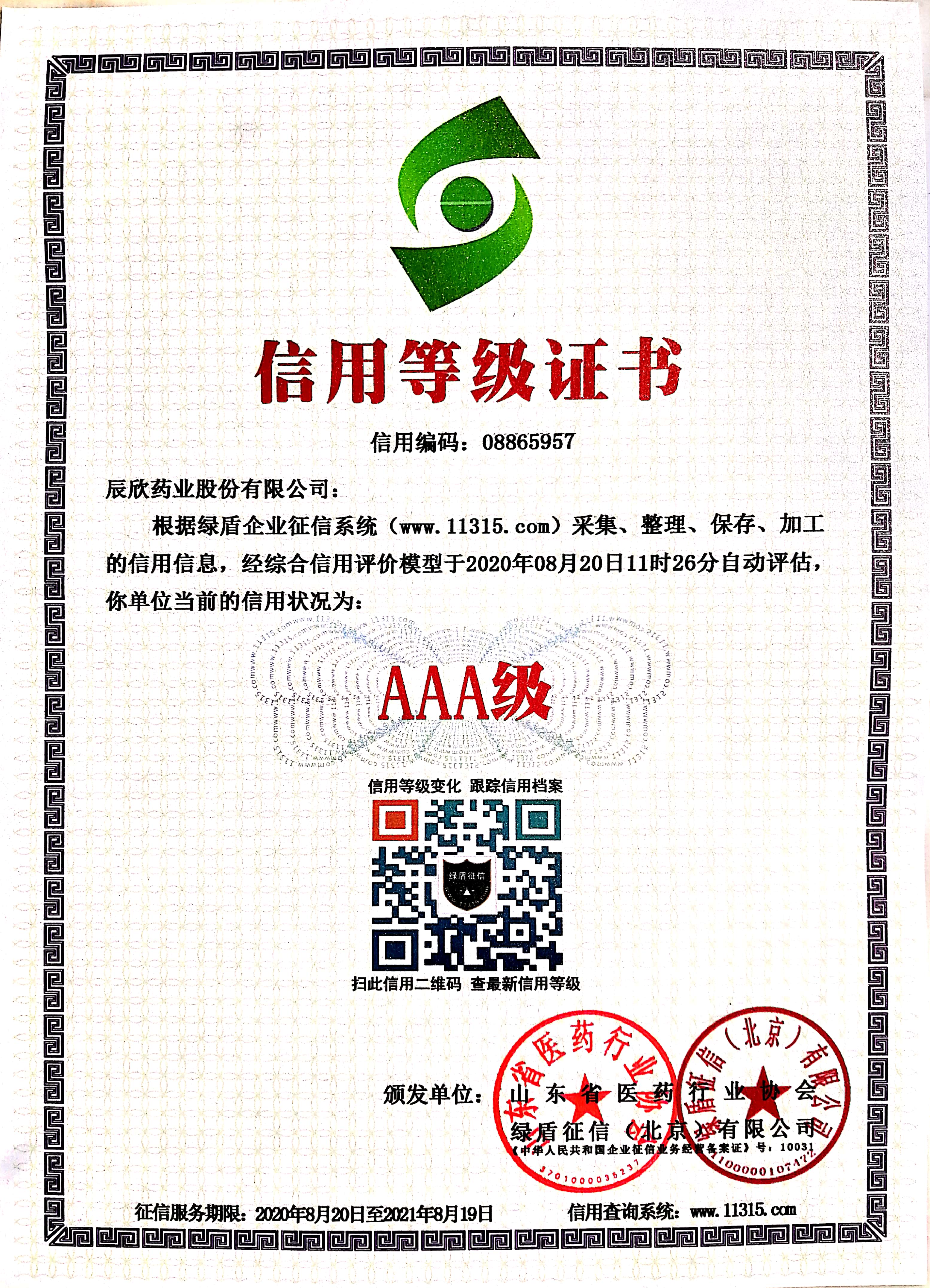 辰欣药业获AAA信用等级证书