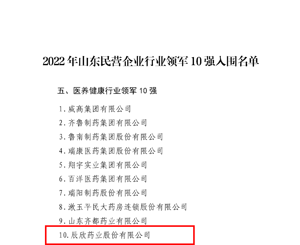 近日,山东省工商联网站发布通告,公示了2022年山东民营企业行业领军10强、创新100强、创新潜力100强、吸纳就业100强入围名单。辰欣药业荣登“医养健康行业领军十强”及“山东省创新百强企业”。